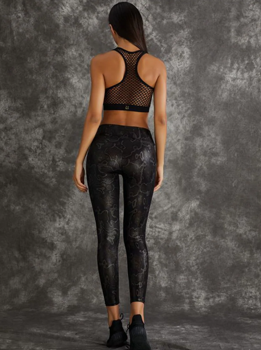 Elevate your style and performance with this dynamic duo. These sleek black snake print leggings offer comfort and fashion in one seamless design. Perfect for day outings or workouts, they effortlessly hug your curves while exuding an edgy vibe. Complete the look with the netted black and blue double layer sports bra, providing both support and style. Stay trendy and confident with this stylish combination