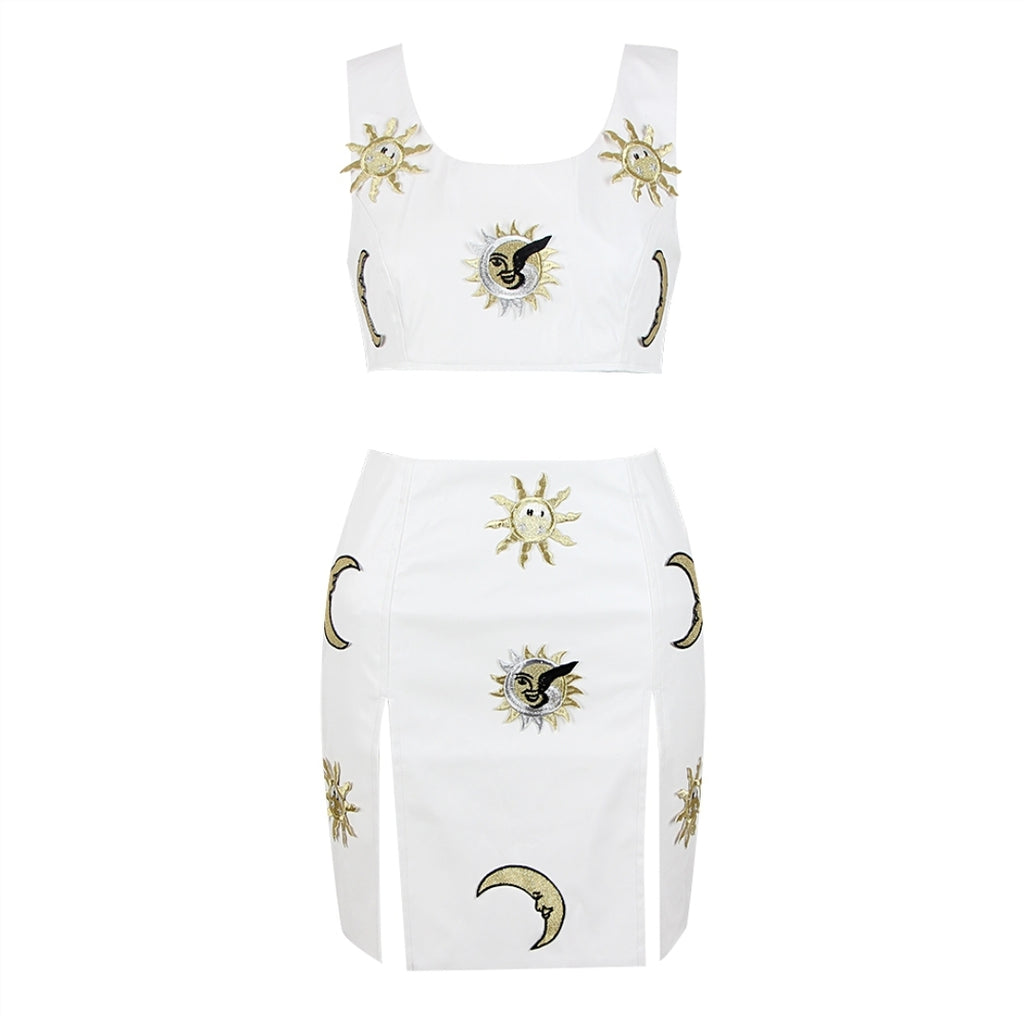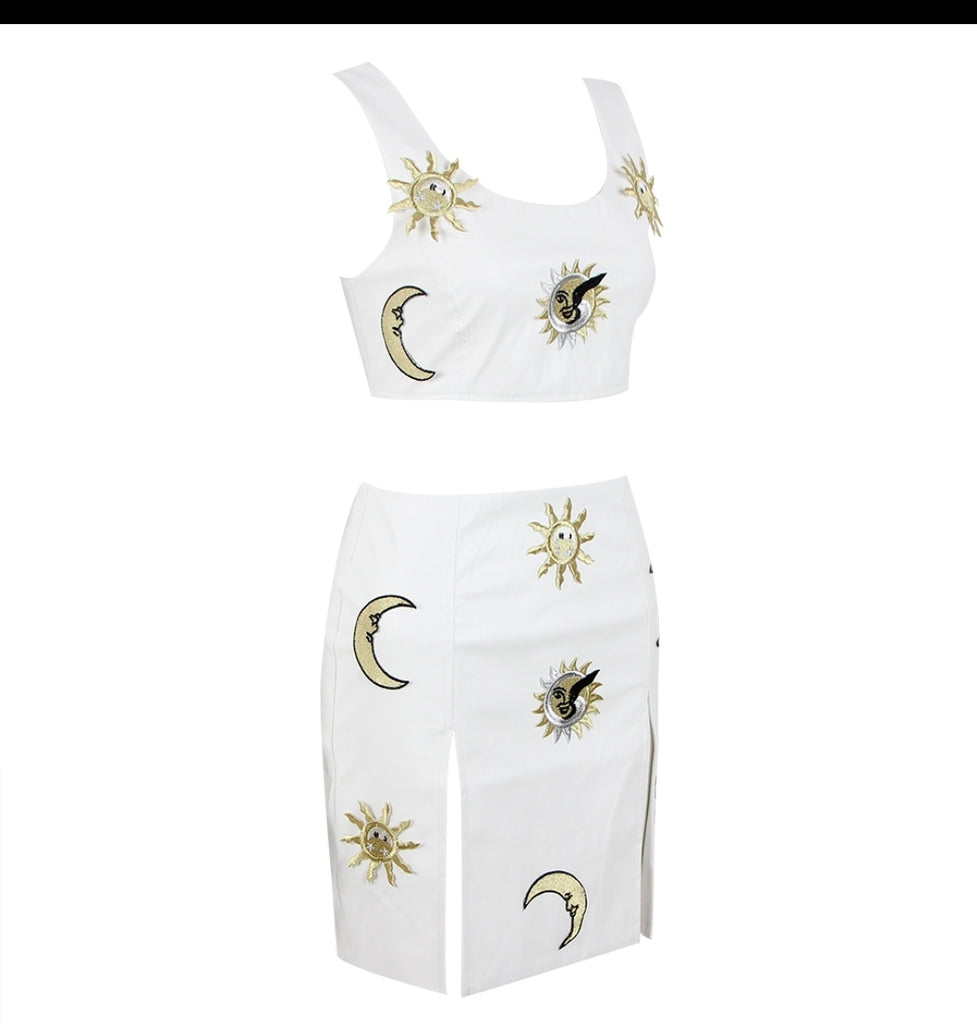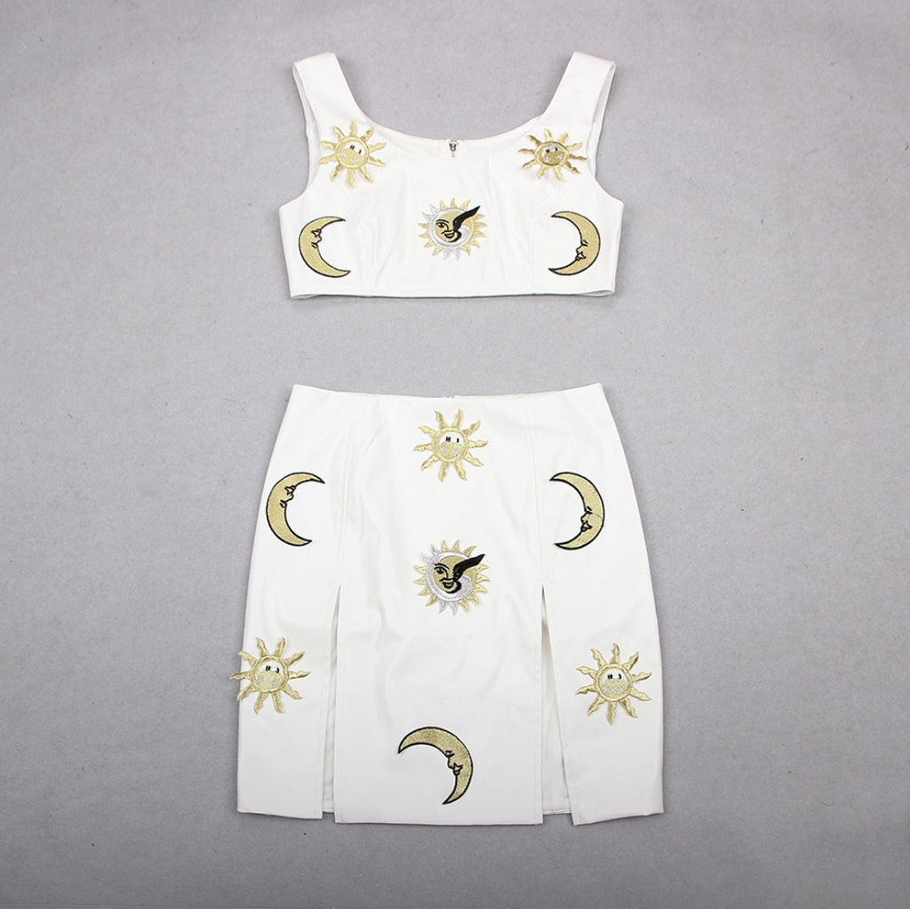 Looking for a trendy and stylish 2-piece set that will elevate your wardrobe? Look no further than our Moon Sun Detail Faux Leather 2-piece set. This set features a stunning faux leather and spandex top and skirt that are both made with high-quality, durable fabric that will stand the test of time.
